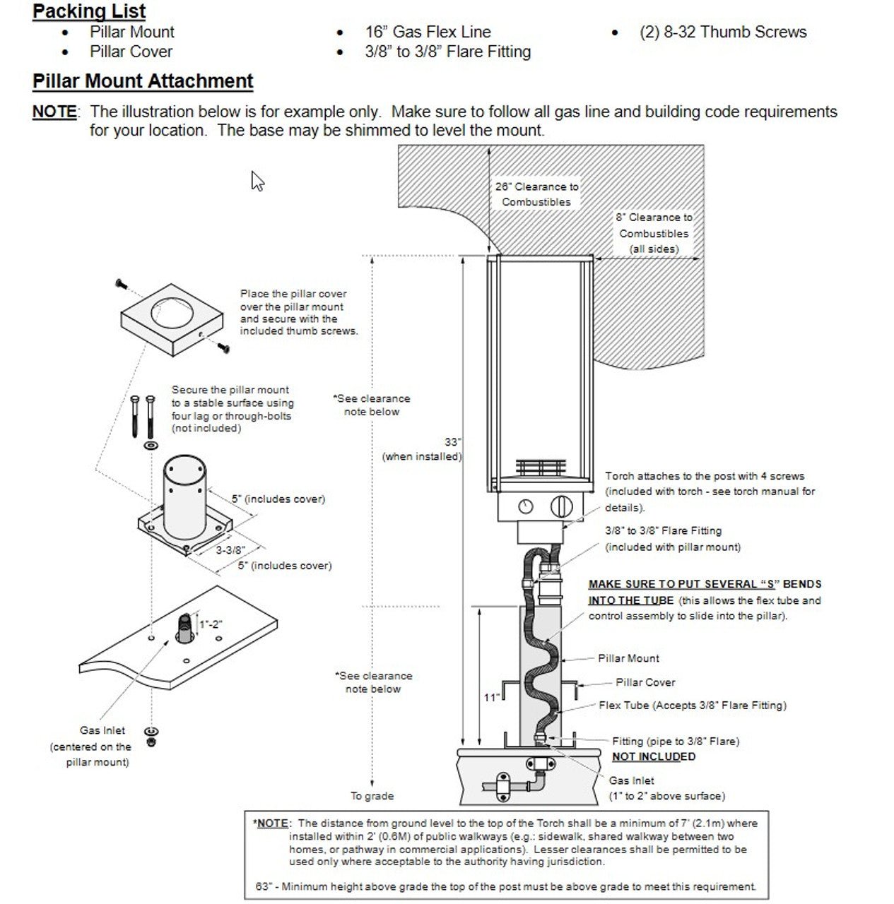 Compatible with Tempest Torch and Lantern models in both 24v and Manual Start (LP/NG) versions, this mount ensures durability and aesthetic appeal. The kit includes a sturdy pillar mount, pillar cover, 16" gas flex line, ⅜” flare fitting, and 8-32 thumb screws—everything needed for a clean and reliable installation. Perfect for both residential and commercial applications, this mount delivers the structural integrity and visual polish to make your Tempest Torch or Lantern a standout feature.