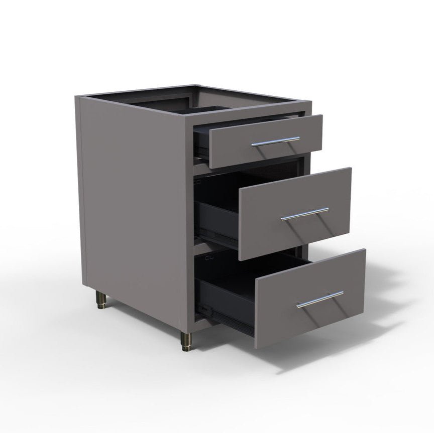 Maximize your kitchen's functionality with this sleek triple drawer base cabinet, available in 18” and 24” widths. Designed with a clean shaker style and smooth-glide drawers, this unit offers ample storage for utensils, cookware, and essentials—perfect for organized, modern living.