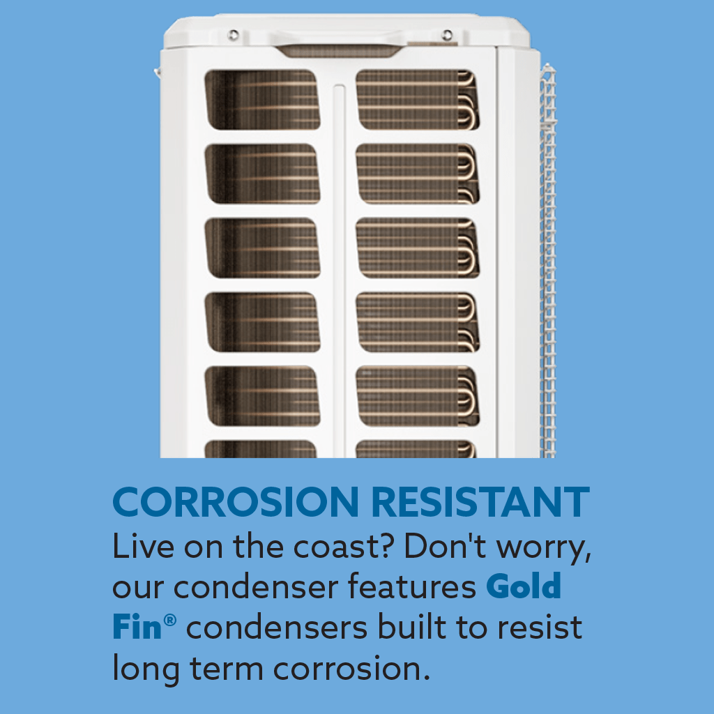 • Superior Corrosion Resistance: The Gold Fin® Condenser is specifically designed to provide exceptional corrosion resistance, making it ideal for coastal homes and ensuring long-lasting performance even in harsh conditions.