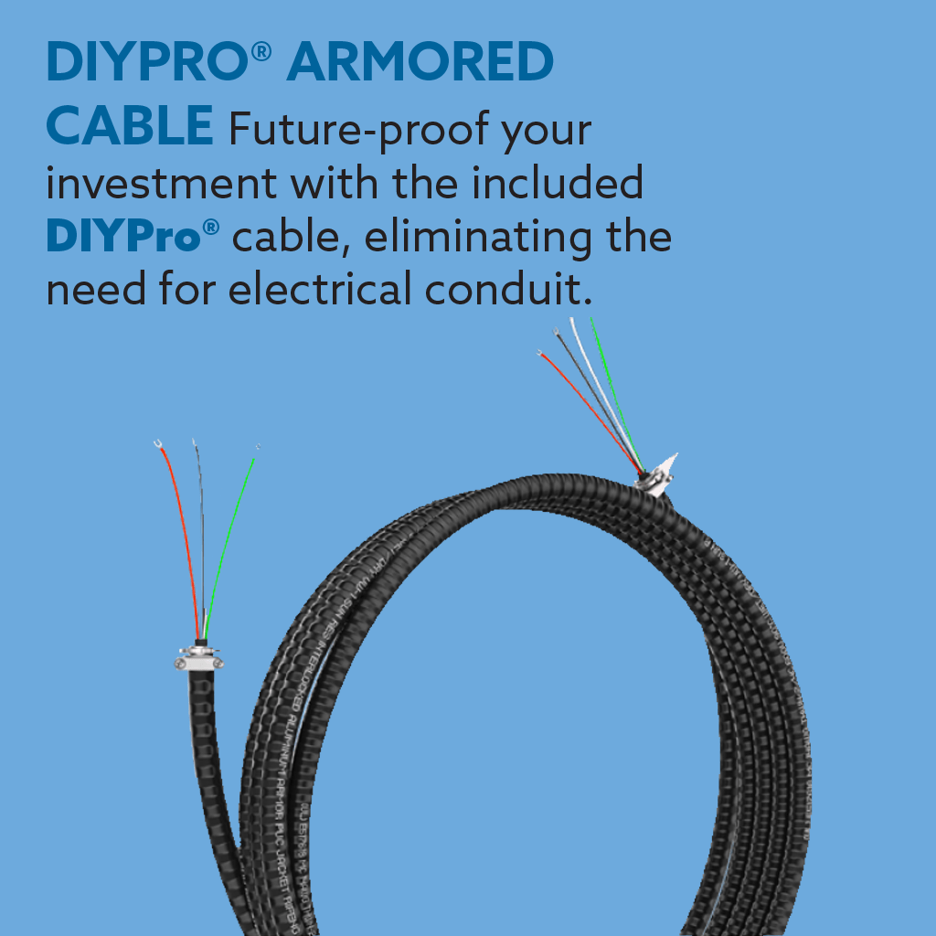 • Durable Design: The included DIYPRO® cable removes the necessity for electrical conduit, providing enhanced durability against outdoor elements and wildlife, ensuring your system remains protected and functional.