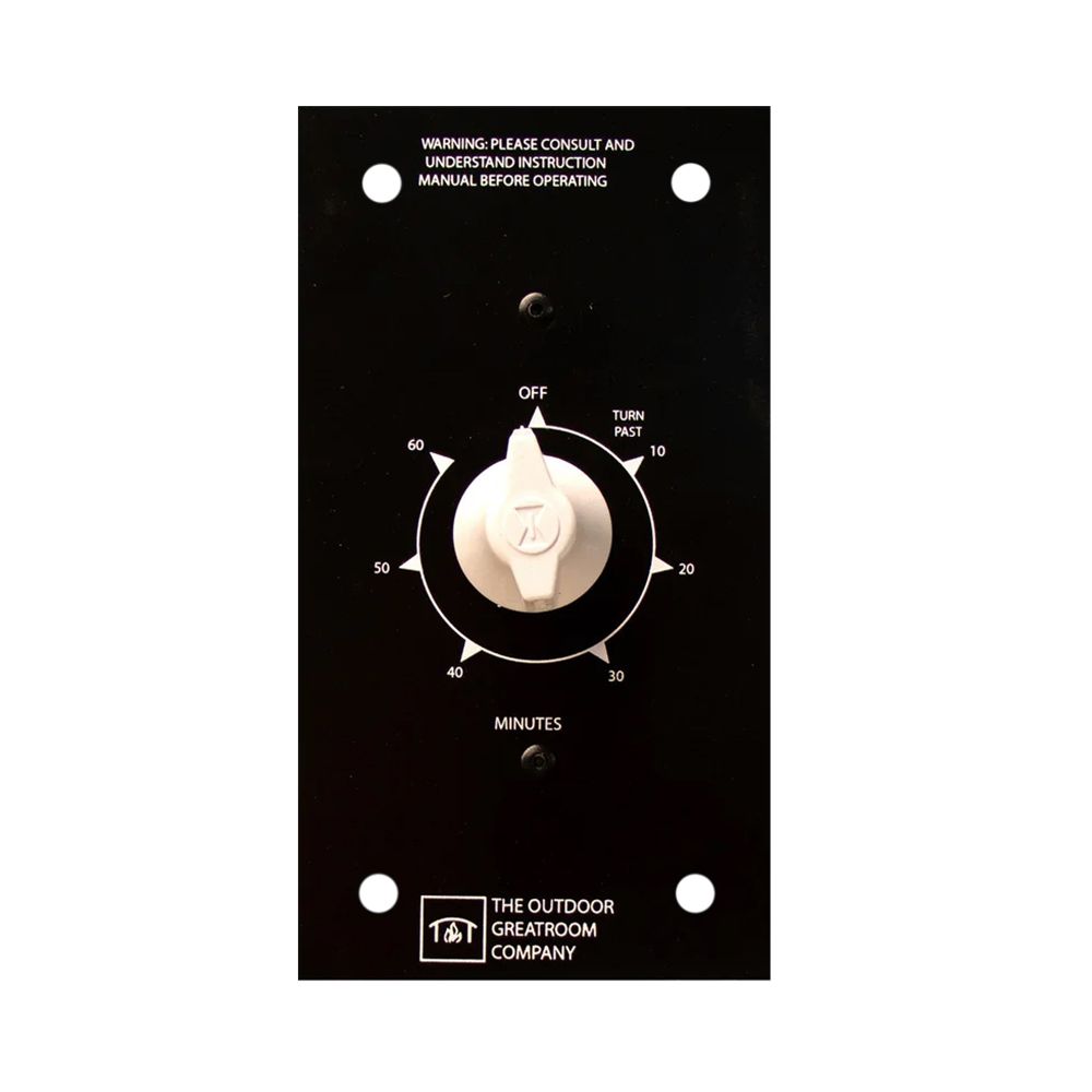 This user-friendly timer replaces the standard on/off switch, allowing you to set your fire pit to run for up to 60 minutes with automatic shut-off. Ideal for safety and convenience, the switch is built into a sleek black powder-coated control panel with a silver faceplate and white knob for easy visibility and control. Engineered specifically for Outdoor GreatRoom’s OGR auto ignition systems, this durable 1-pound unit offers reliable performance in outdoor environments while enhancing your patio's fire feature.
