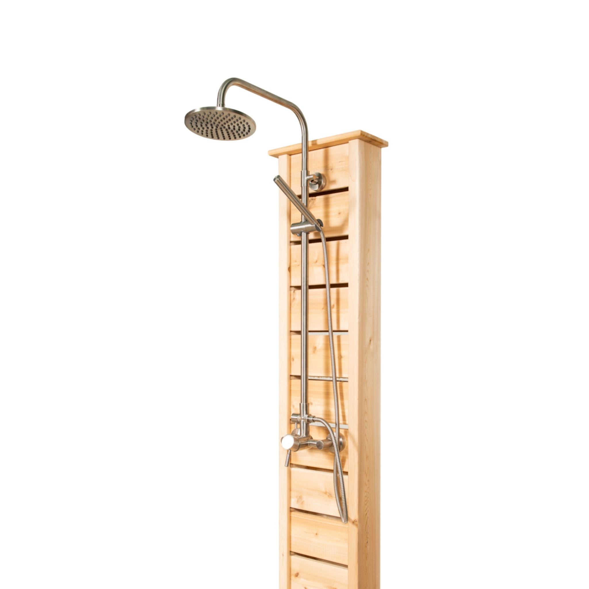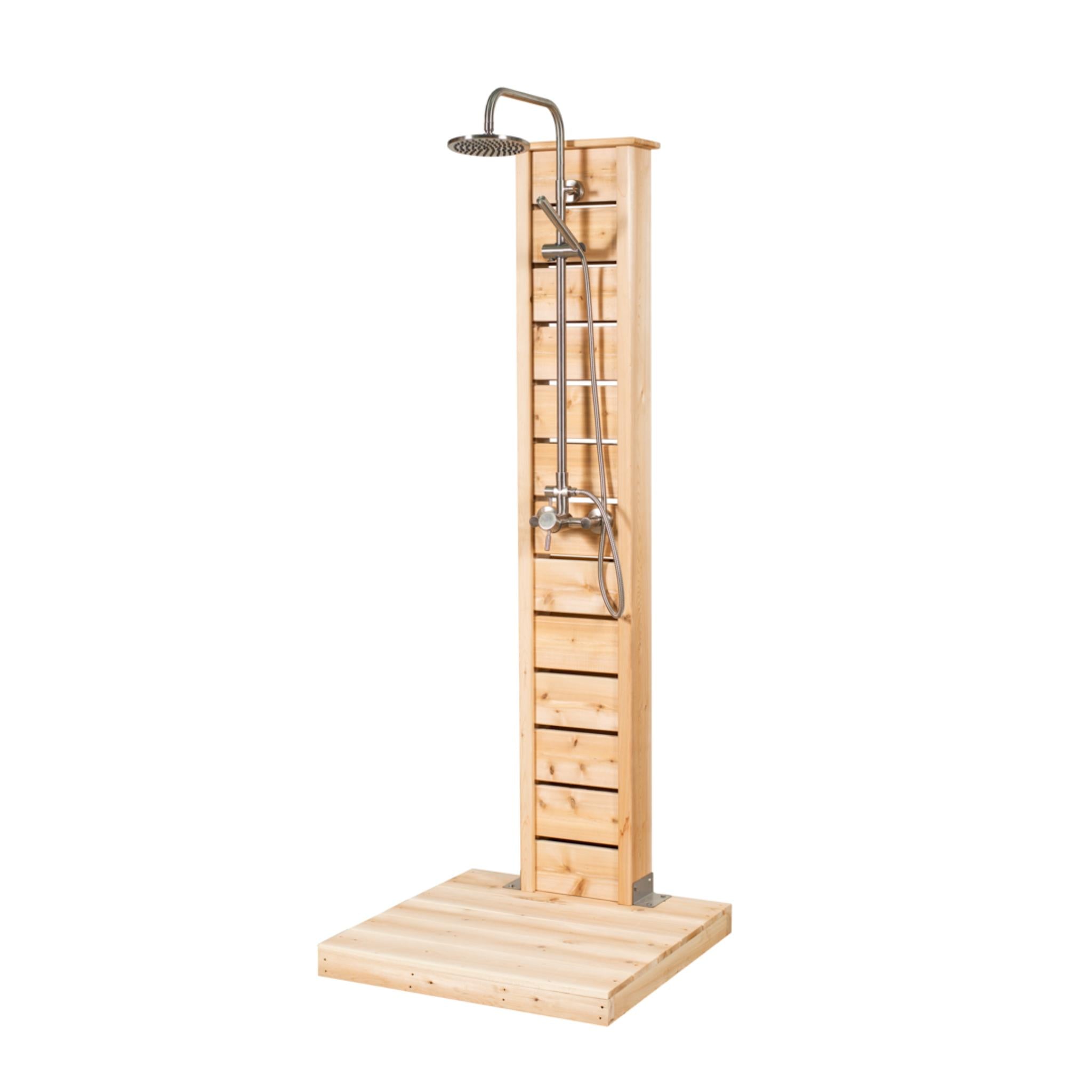 Stylish Design: Crafted from high-quality materials, the Sierra Pillar Shower features a beautiful natural wood finish that complements any outdoor decor. Its elegant design not only serves a practical purpose but also enhances the aesthetic appeal of your outdoor area.