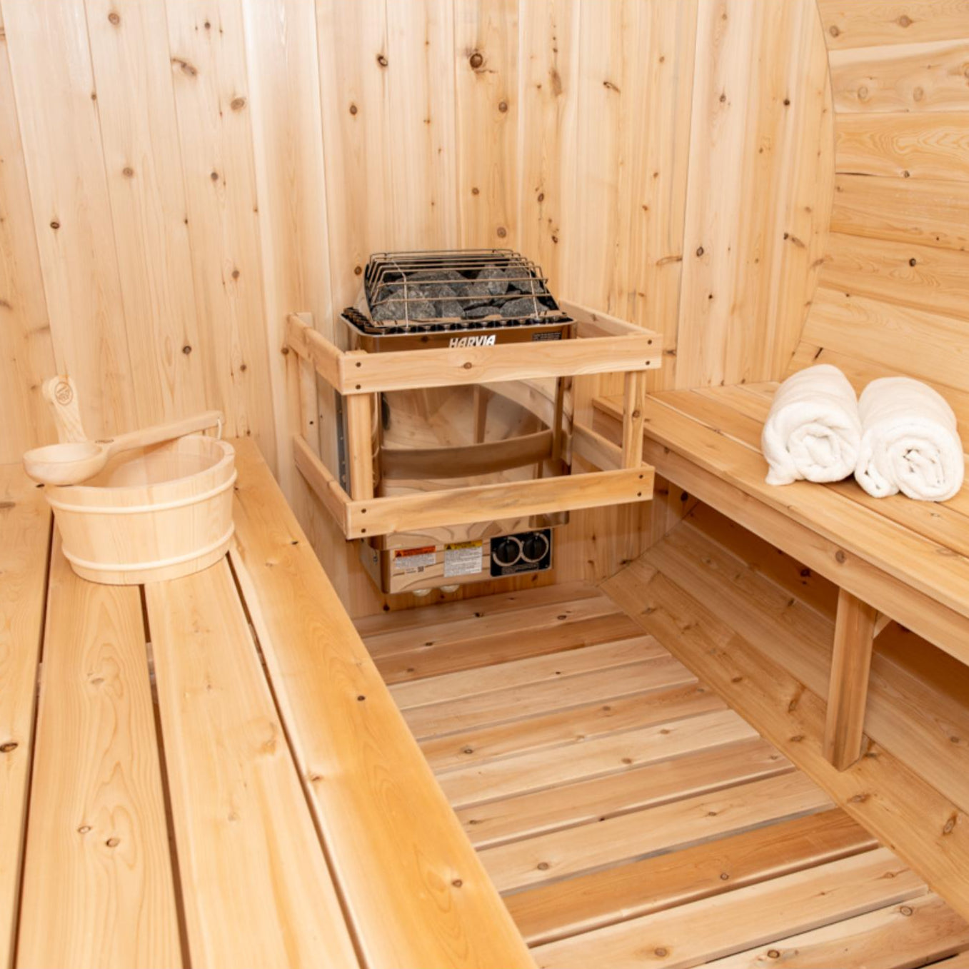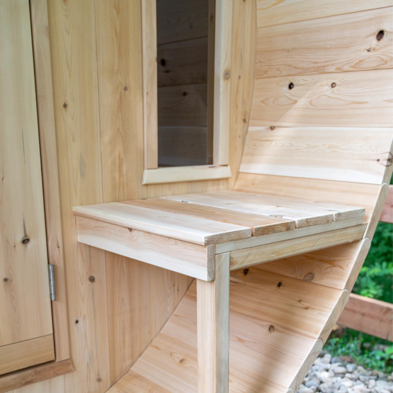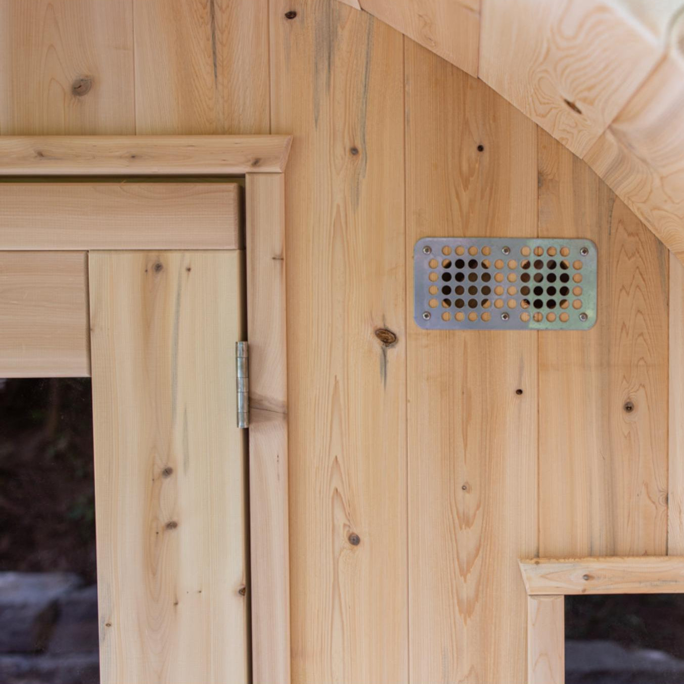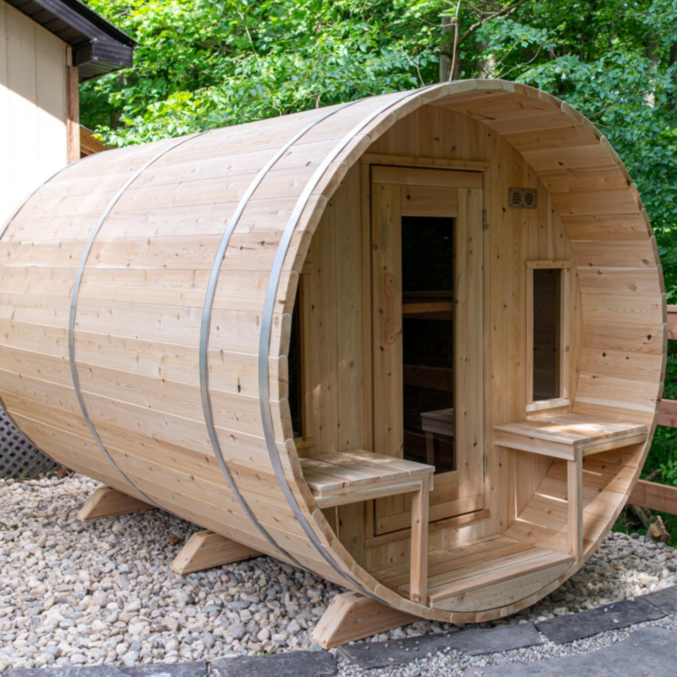 Experience the ultimate in relaxation and craftsmanship with the Canadian Timber Tranquility Barrel Sauna. Designed to accommodate 6-8 people, this sauna is perfect for larger families or as a favorite gathering spot for friends. Handcrafted from premium Eastern White Cedar, known for its lighter color and tight knots, this sauna combines aesthetic appeal with durability.