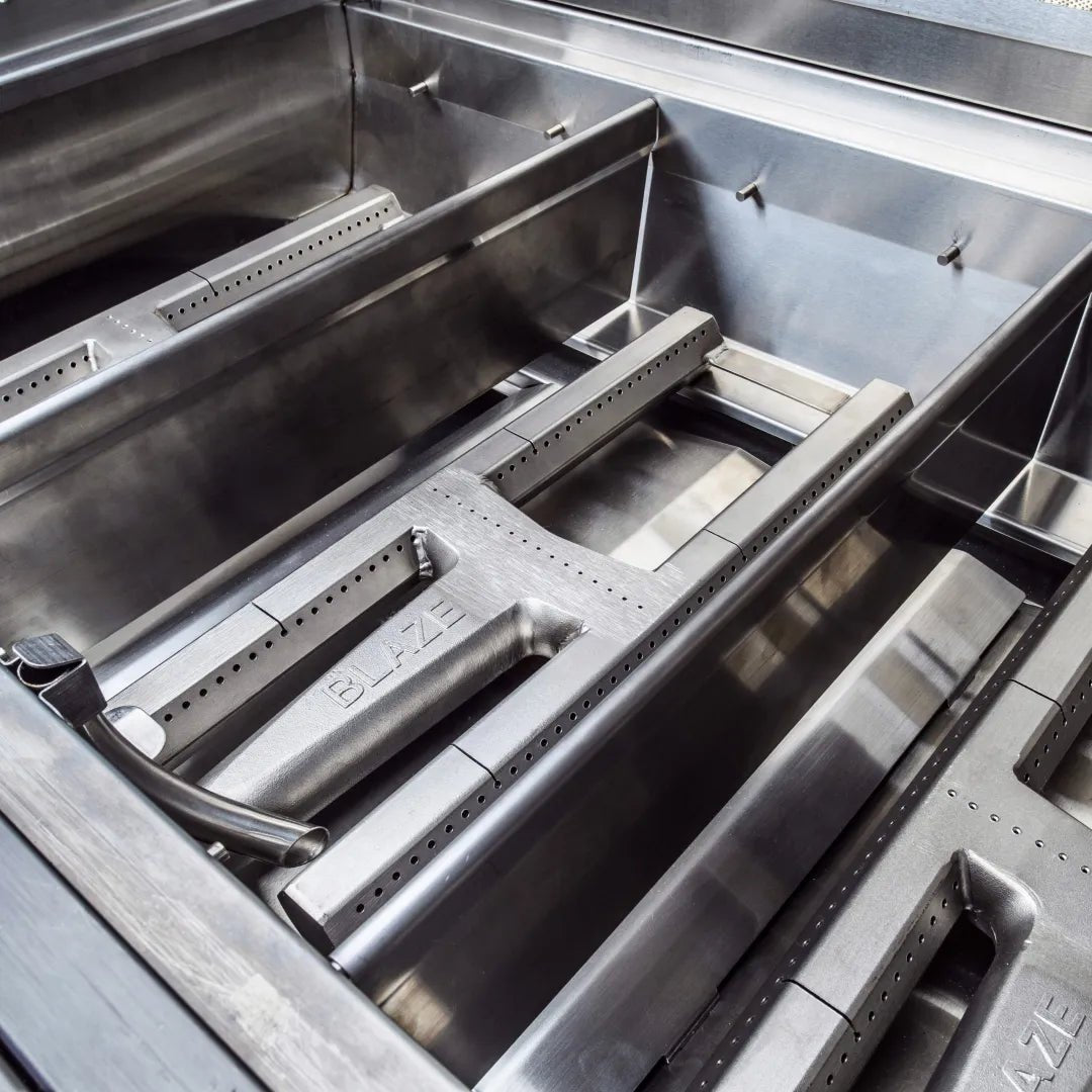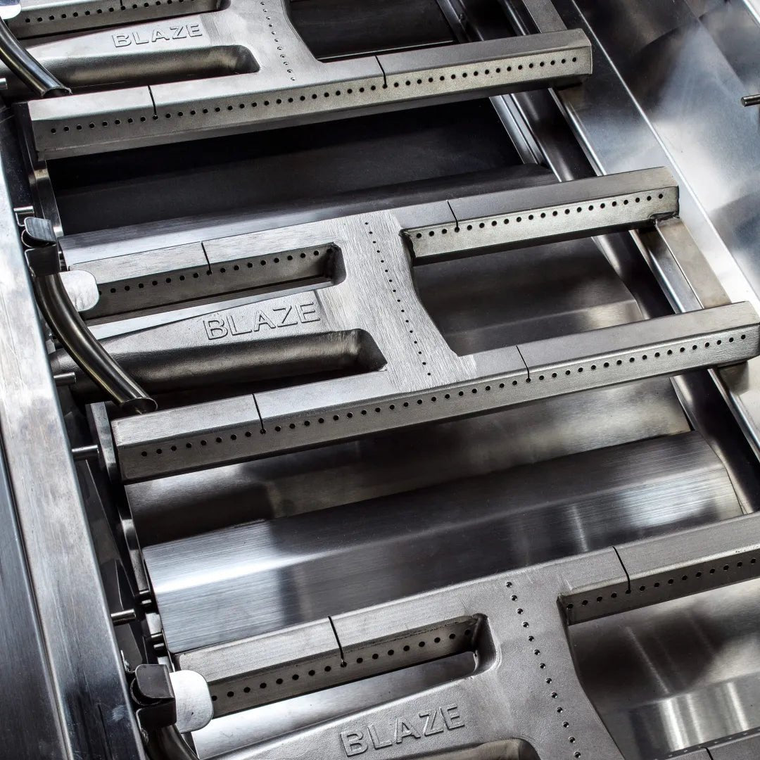 Designed with durable 304 cast stainless steel H-burners and heavy-duty 12mm hexagonal cooking rods, this grill delivers unmatched searing power and longevity. Its 54,000 BTUs of main cooking power and 10,000 BTU infrared rear burner make it perfect for gourmet rotisserie dishes. Heat zone separators offer customized temperature control across 816 sq. in. of cooking space, while interior halogen lights and illuminated control knobs enhance nighttime grilling. Backed by Blaze’s Lifetime Warranty, it’s built to last and impress. Ideal for any premium outdoor kitchen setup, the Blaze LUX is the pinnacle of performance and elegance.
