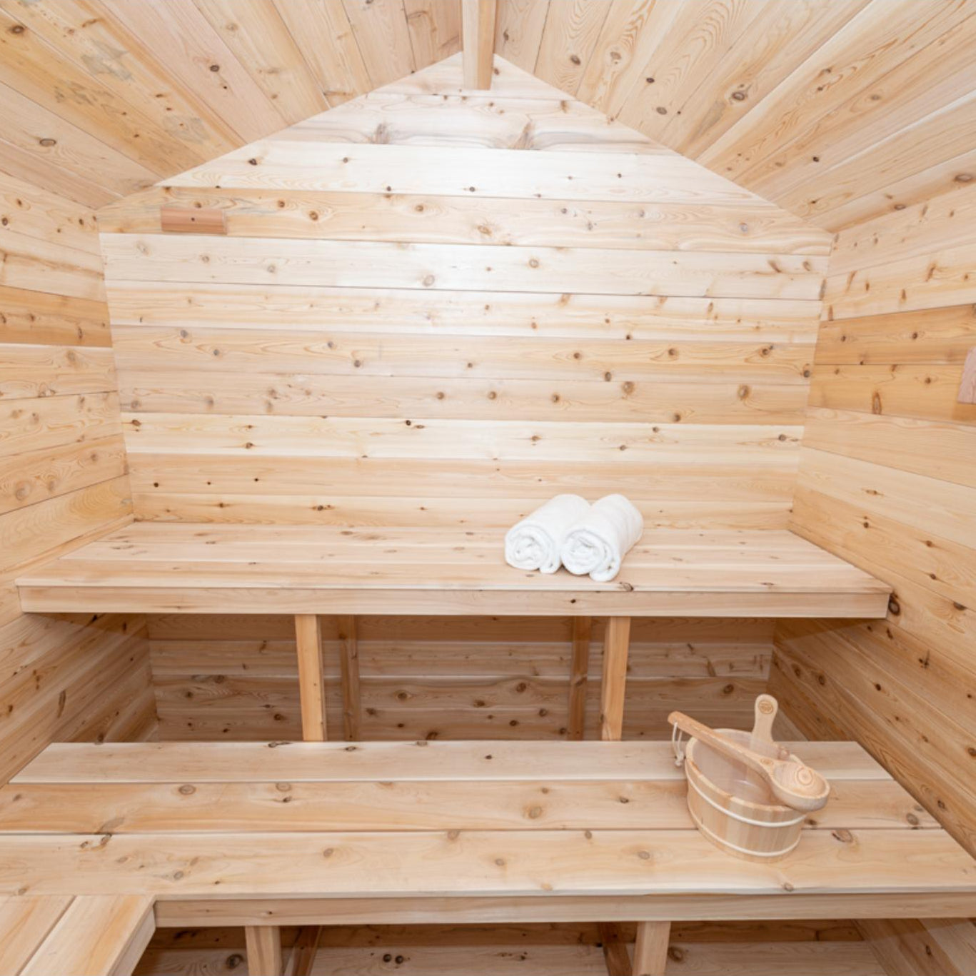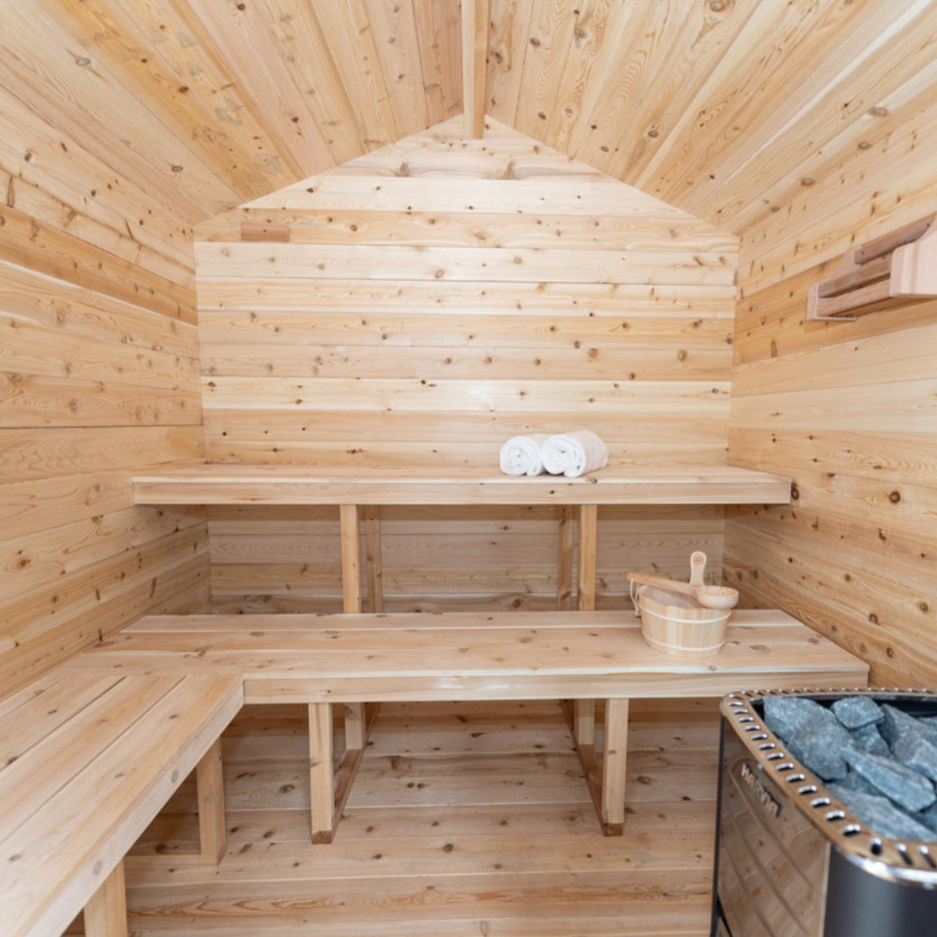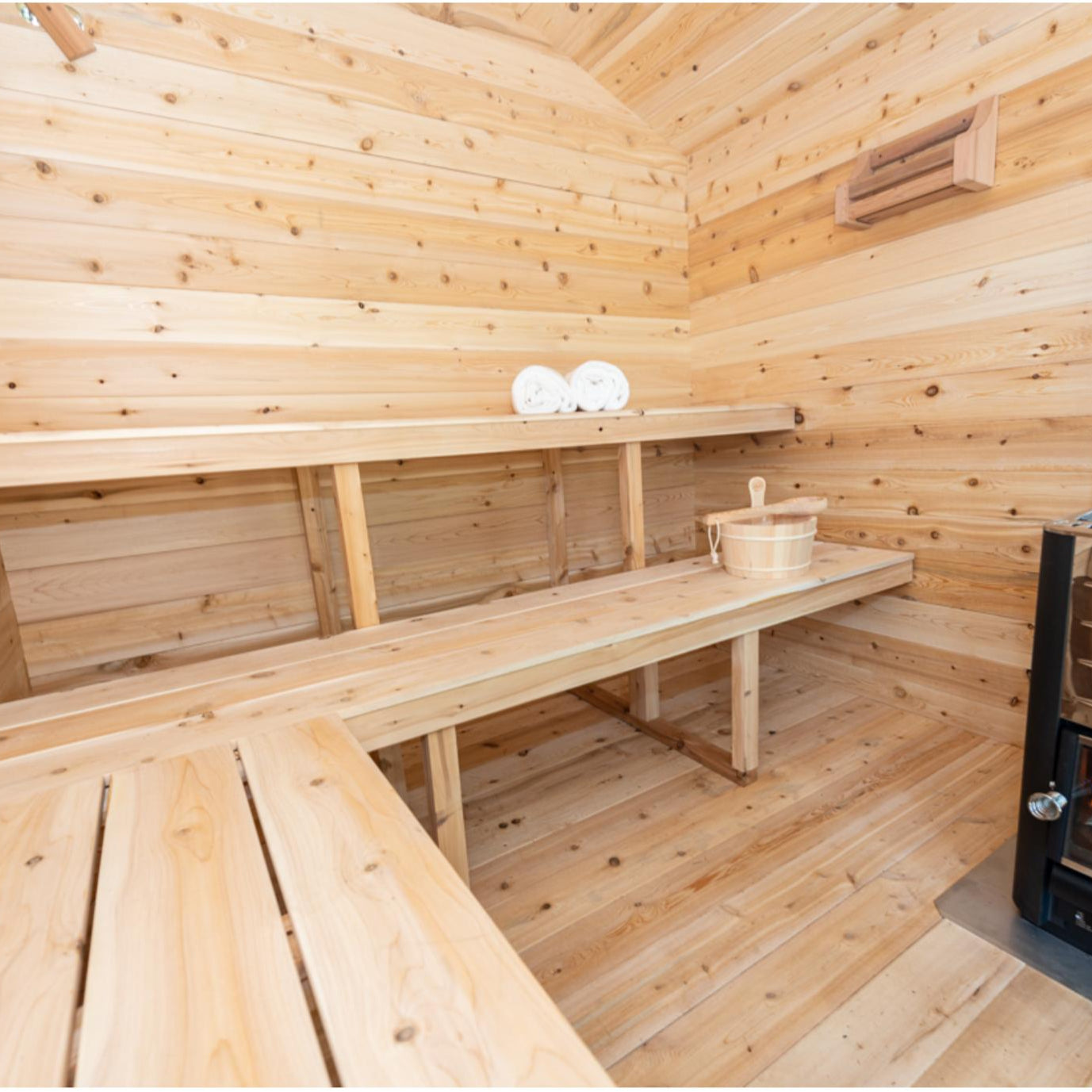 Comfortable Solid Wide Benches: Relax in comfort with solid wide benches that provide ample seating space for you and your guests, allowing you to unwind and enjoy the soothing heat.