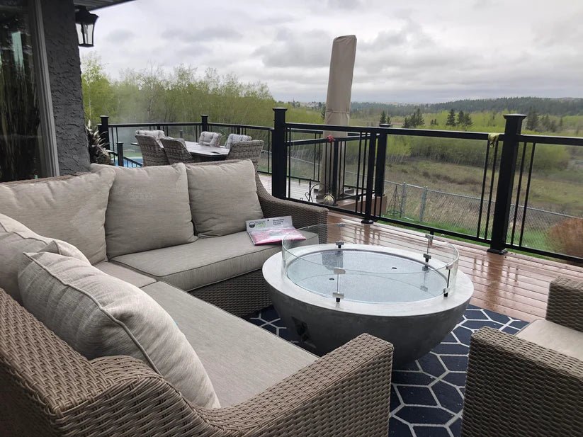 Crafted from rich, dark Supercast™ concrete, the base provides a unique and naturally varied appearance, complete with subtle pitting and tonal differences. At the center lies a powerful 42" round Crystal Fire® Plus Burner, outputting up to 106,000 BTUs, topped with clear tempered fire glass for a striking flame display. Designed for contemporary outdoor settings, this fire bowl includes a grey glass burner cover and offers optional upgrades like a wind guard and protective cover. Made in the USA and UL Listed, it supports both propane and natural gas configurations and features manual or electronic ignition options.
