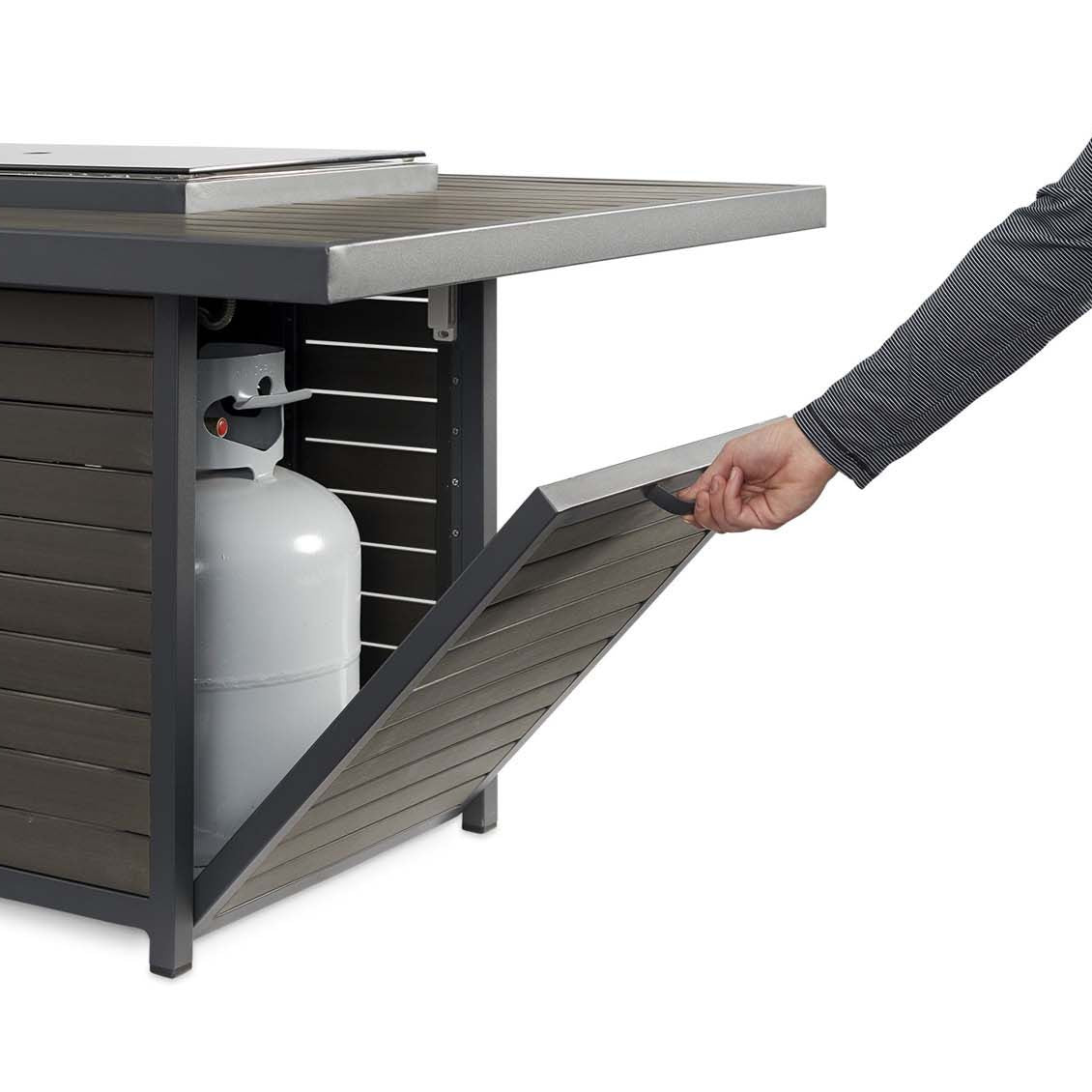 Featuring a contemporary composite deck-style top and base with powder-coated aluminum, this fire table offers durability and sleek aesthetics. The powerful 12x24-inch stainless steel burner produces up to 55,000 BTUs and sits elevated to reduce heat transfer—perfect for keeping beverages cool. It includes a push-button spark ignition system, diamond fire glass, and an integrated storage base for a 20 lb. propane tank. Easily convertible to natural gas, this fire pit combines convenience, safety, and eye-catching style for your patio gatherings.